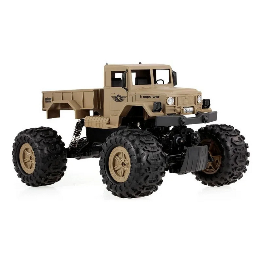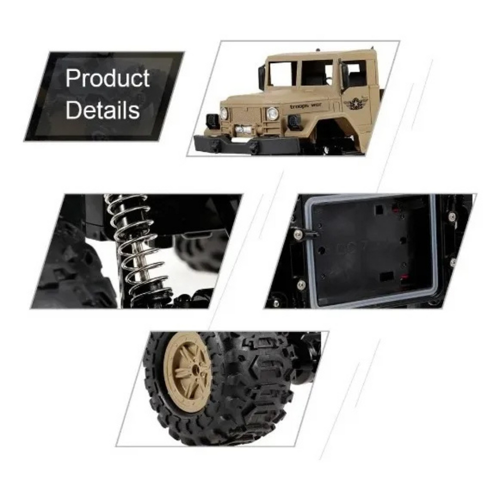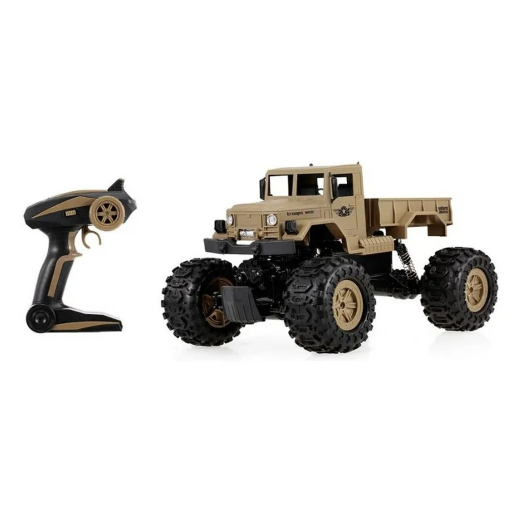 ¿Estás listo? Una Camioneta Militar a control remoto genial. Presenta una proporción completa a escala 1/12 y un diseño único de coche de tropas, ofreciendo a sus hijos una experiencia de conducción real y emocionante. Con sus cuatro ruedas de oruga de diseño especial y sistema de suspensión independiente, este coche puede circular en la nieve, la arena y la roca sin problemas, lo que le proporciona un rendimiento de funcionamiento estable. Además, está equipado con un sistema de control remoto súper de 2,4G, el rango de control máximo puede ser de hasta 50 metros. Características: Funciones: adelante, atrás, girar a la izquierda, girar a la derecha, sistema de accionamiento 4WD, control remoto 2,4G, rango remoto de 50m, antichoque, todoterreno Con motor de doble alta resistencia y rueda en forma de oruga, este coche de roca puede circular en varias condiciones de carretera, dándote una sensación heroica. El sistema de suspensión independiente de cuatro ruedas y los amortiguadores garantizan una práctica de conducción estable. 2,4 GHz admite un rango de control remoto de unos 50 metros y proporciona una buena capacidad antiinterferencia, jugando con tus amigos simultáneamente. Un diseño genial de camión militar y escala 1/12 hace que el coche sea más atractivo, un gran regalo para niños. Con una batería recargable de gran capacidad, el tiempo de funcionamiento puede llegar hasta unos 20 minutos. Incluye 1 bateria recargable de 7.2v El radio control requiere 3 pilas AA (No incluidas) Edad 5+. Los precios de éste sitio web son exclusivos para compras online y no necesariamente coinciden con los precios en el local.