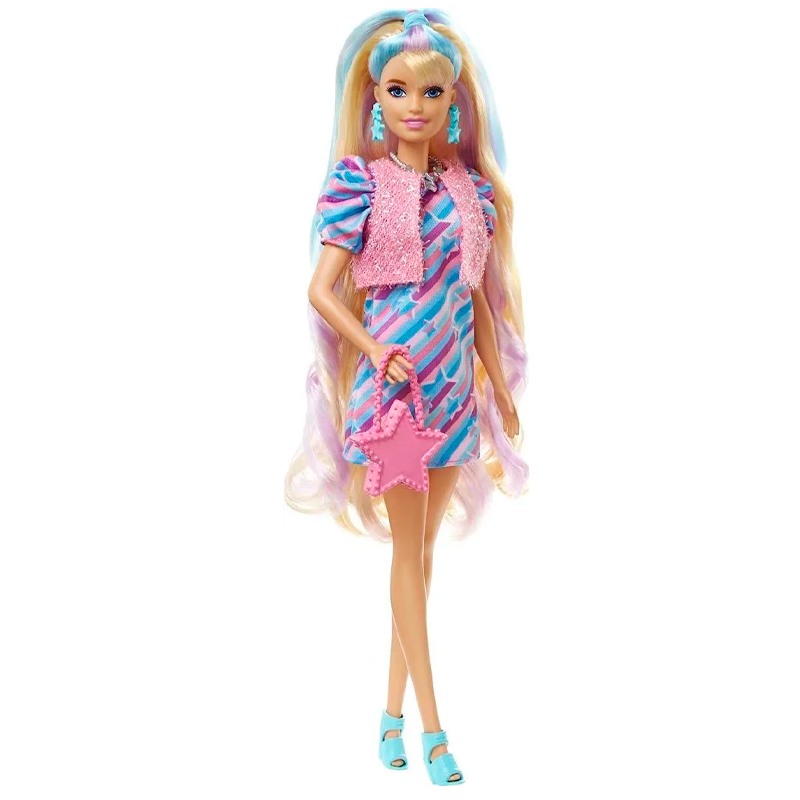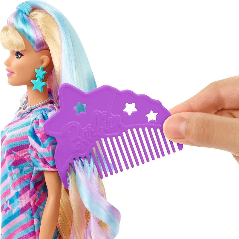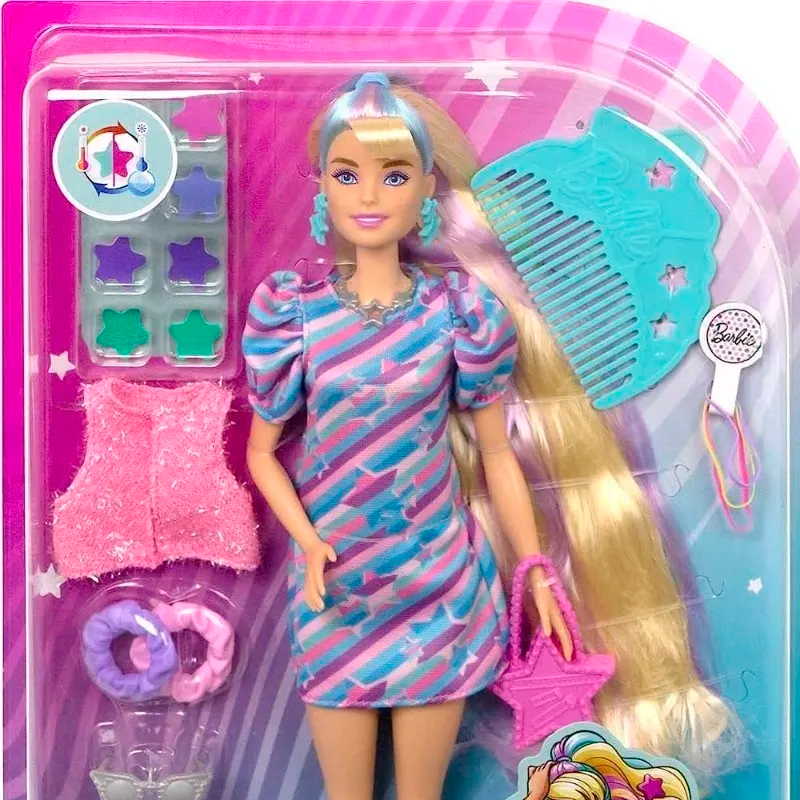 La muñeca Barbie Totally Hair con temática de estrellas luce su propio peinado, textura de cabello y aspecto de moda y está inspirada en la muñeca más vendida que debutó por primera vez hace 30 años Barbie La muñeca tiene 8.5 pulgadas de pelo extralargo y viene con más de 15 piezas adicionales: 8 son pinzas de pelo que cambian de color, un peine, 1 juego de lazos para el pelo, 2 coleteros, moda de chaleco metálico, bolso, gafas de sol y un collar. Los clips de cambio de color vienen en 4 colores diferentes y cambiarán de color con el calor de los dedos, los niños se divertirán con todas las posibilidades de estilo Con una forma original del cuerpo, la muñeca con temática de estrellas viene con flequillo lateral como un guiño a la muñeca original Barbie Totally Hair Plus tiene hermosos reflejos morados y azules. Su vestido cuenta con un estampado de estrellas con detalle de manga abombada.. Los precios de éste sitio web son exclusivos para compras online y no necesariamente coinciden con los precios en el local.