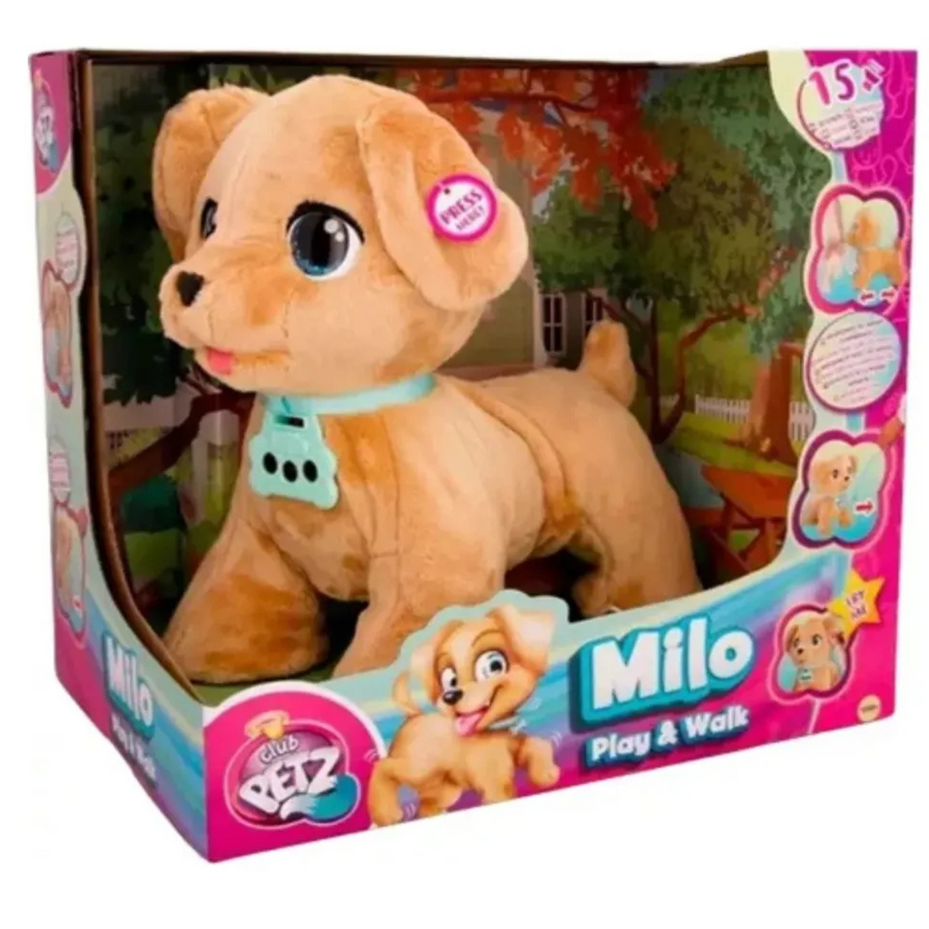 Peluche de Perrito Milo que juega y camina 1932 81314MS El perrito juguetón Milo hace trucos cuando agitas tu mano. Milo gira y se mueve hacia adelante y hacia atrás. Ate el cinturón al collar y salgan a caminar juntos. Más de 15 funciones de sonido. Milo gira y se mueve hacia adelante y hacia atrás. Incluye 4 pilas AA.